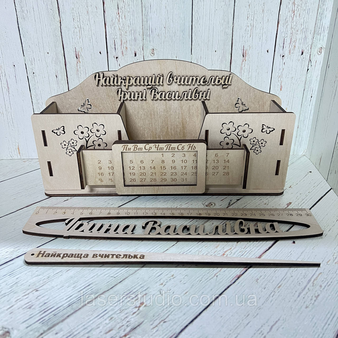 Подарунок, який стане ідеальним вибором для вчителя! Дерев’яний органайзер із вічним календарем та іменна лінійка 30 см – це стильний і функціональний аксесуар для робочого столу, що допомагає зберігати порядок.